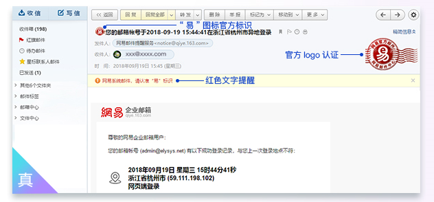 2. 开启邮件时:邮件题目含有“易”标志,电脑鼠标置放标志显示信息“网易官方网邮件”,提醒区有鲜红色文本安全提醒,邮件右边有“易”logo标志。
