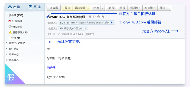 1. 寄件方邮箱帐号来路不明(网站域名非http://qiye.163.com),发货人名字却显示信息“网易企业邮箱”、“网易客户服务中心”、等;